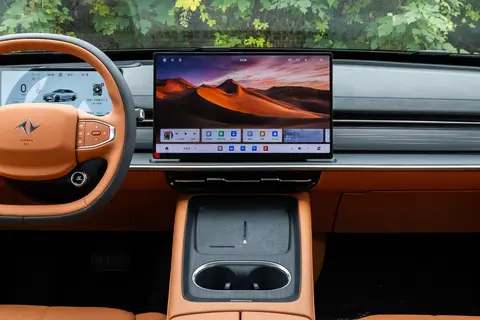 拉开车门,eπ007 + 的内饰延续了简洁实用的风格,没有过多复杂装饰,却能让人感受到恰到好处的科技氛围。中控台上,15.6 英寸悬浮式大屏格外显眼,配合 10.25 英寸矩形液晶仪表与 HUD 抬头显示系统,形成 “三屏联动” 的交互布局,驾驶时查看导航、调节车辆设置都很方便,视线不用频繁离开路面。
