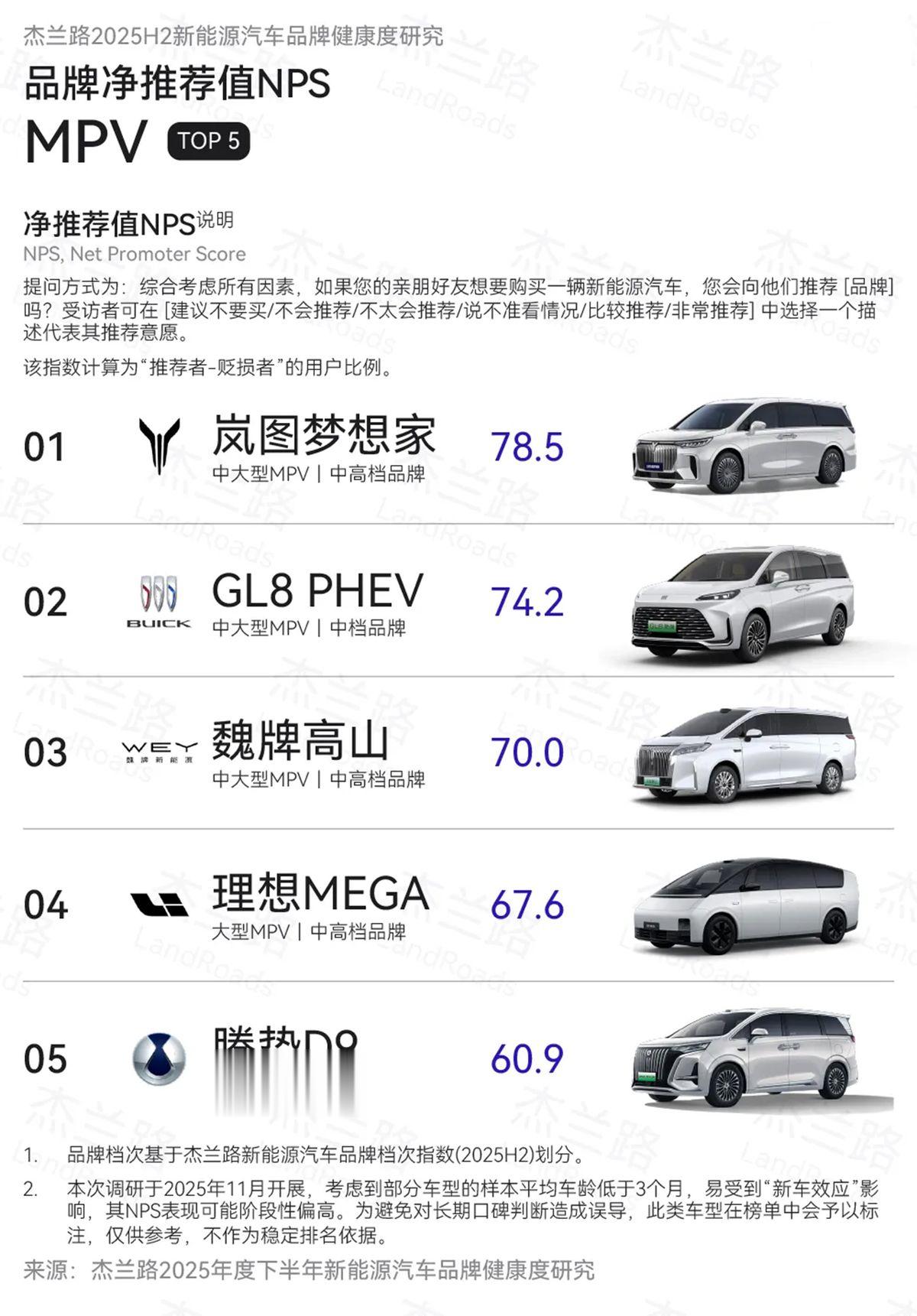 1月10日数据显示,岚图梦想家在2025年下半年销量为43191台,再次蝉联高端MPV第一,2025全年达到80248台,同比增长46%。另据杰兰路发布的《2025年度下半年新能源汽车品牌健康度研究(NPS篇)》,岚图梦想家在2025年下半年以78.5分的净推荐值(NPS)位居新能源MPV榜首。作为豪华旗舰MPV,岚图梦想家在2024年、2025年连续蝉联MPV用户净推荐值第一,成为销量与口碑的“双料冠军”,持续引领中国高端MPV。