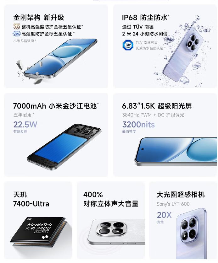 红米Note15 Pro新春版:天玑7400-Ultra老江湖U,7000mAh电池虽然比荣耀少30%,但IP68防尘防水+龙晶玻璃十倍抗摔很骚——相当于既给你续航又给你"防弹衣"。车厘子红配色确实喜庆,过年送礼我妈都说好看。