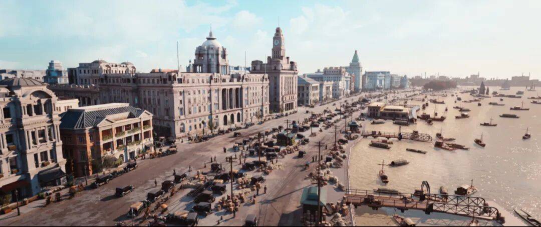 《灼灼韶华》中通过虚拟拍摄还原的民国上海滩黄浦江码头。