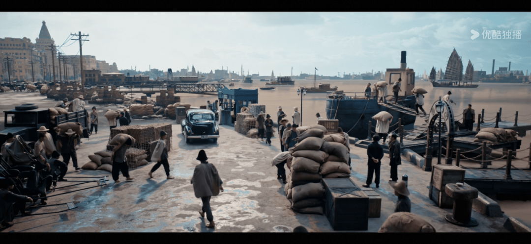 “查阅了上世纪20-30年代上海的货运码头影像资料以后,找到了一个码头作为参考,为了增加戏剧性,我们决定以外滩旁的万国建筑群为背景,将这个货运码头1:1写实复原出来。最终设计出我们在剧中所看到的‘上海滩’。”冲亚说。