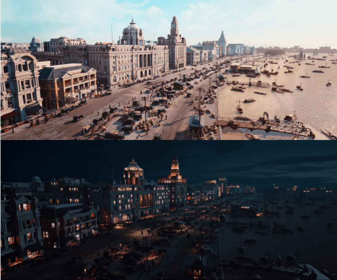 冲亚介绍,这个“上海滩”的整个设计时长,只需要25天,到具体布置场景阶段只需6天。甚至在拍摄时效率也要更高,由于数字化制作团队已经提前设计好了全部场景,剧组无需像实拍一样多次转场,就能一口气拍摄好所有涉及老上海街道、码头的场景,实际测算下来,相关场景的整体拍摄效率要比实拍提升30%。