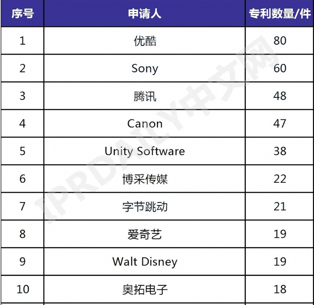 今年3月20日,全球知名知识产权分析机构IPRdaily发布了《全球虚拟拍摄技术发明专利排行榜(TOP 30)》。根据榜单排名,优酷以80件虚拟拍摄发明专利位列全球榜首,日本的索尼和中国的腾讯分列二三位,专利数分别为60件和48件。