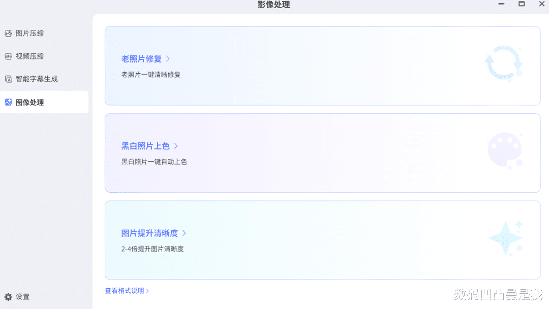 影像处理除了支持图片、视频压缩外,对于没有字幕的国外影视剧,还可通过处理智能识别并生成中文字幕,对于追剧党来说相当贴心。图像处理还能对老照片进行修复、为黑白照片上色或者提升图片清晰度,虽然不是常用功能,但在需要的时候可以直接用,毕竟网上同类型的功能基本都是付费使用的。