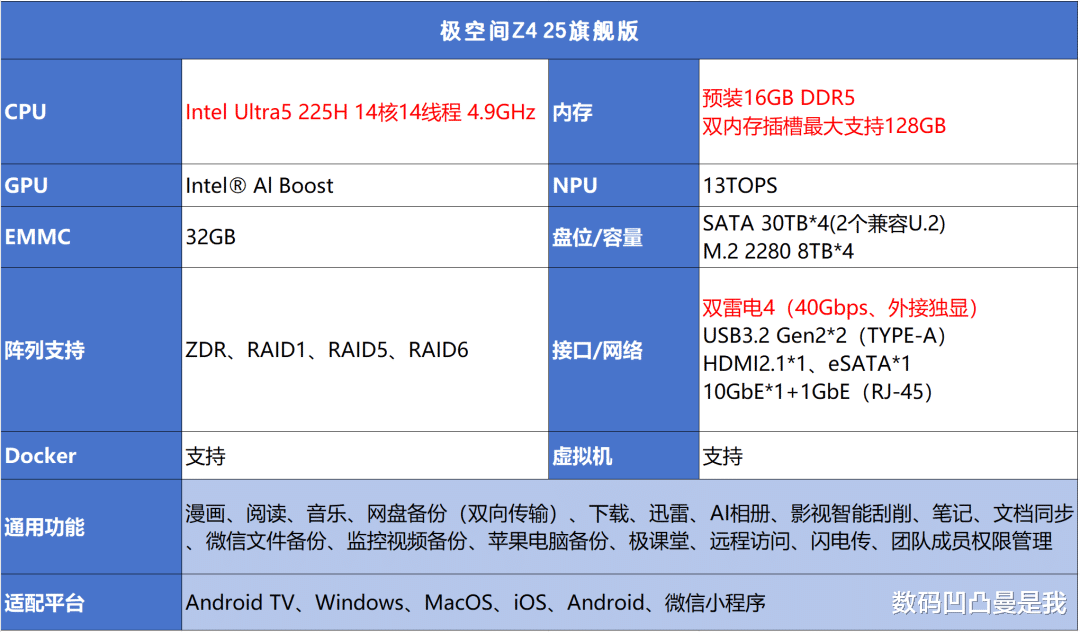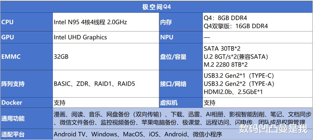 Q4侧重易用性和家庭影音、文件相册备份等基础场景,双擎版在多任务处理和高负载应用上更有优势(Docker、虚拟机、大文件处理等),更适合生产力场景。