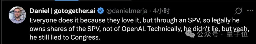有投资者指出,严格地说奥特曼持有的股份通过SPV(特殊目的载体)实现,从法律意义上讲确实不算OpenAI的股份。