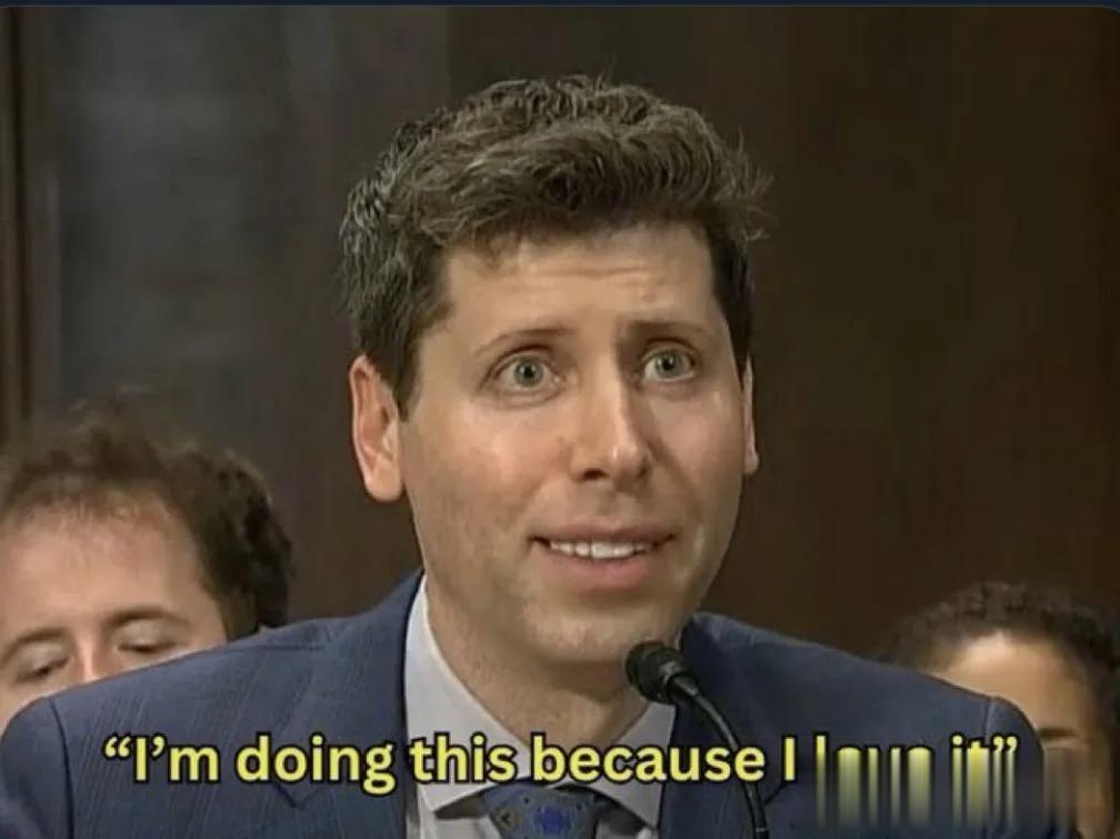 奥特曼做ChatGPT是出于热爱还是股份2024年,奥特曼曾在国会听证会上一脸无辜的表示: