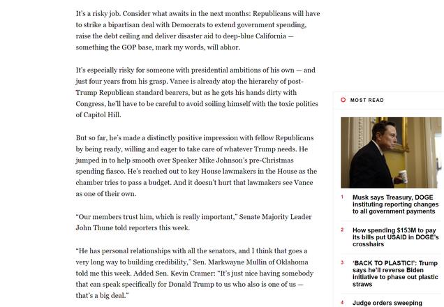 但到目前为止,他在共和党同僚中给人留下了明显的积极印象,因为他准备好了,愿意并渴望照顾特朗普需要的任何事情。他跳出来帮助平息众议院议长迈克·约翰逊 (Mike Johnson) 在圣诞节前的消费惨败。在众议院试图通过预算时,他已经联系了众议院的主要众议院立法者。立法者将万斯视为他们自己的一员,这并没有什么坏处。