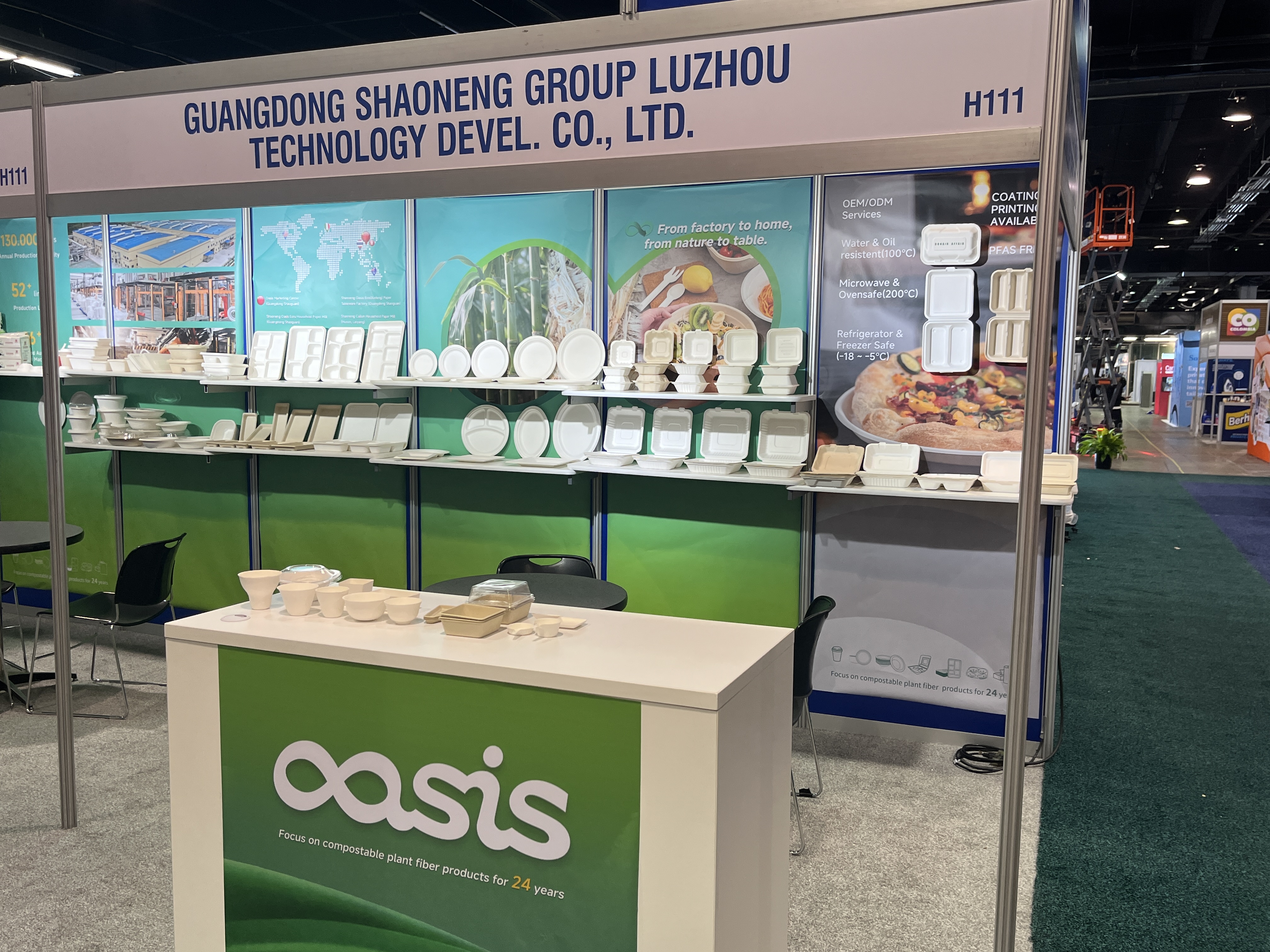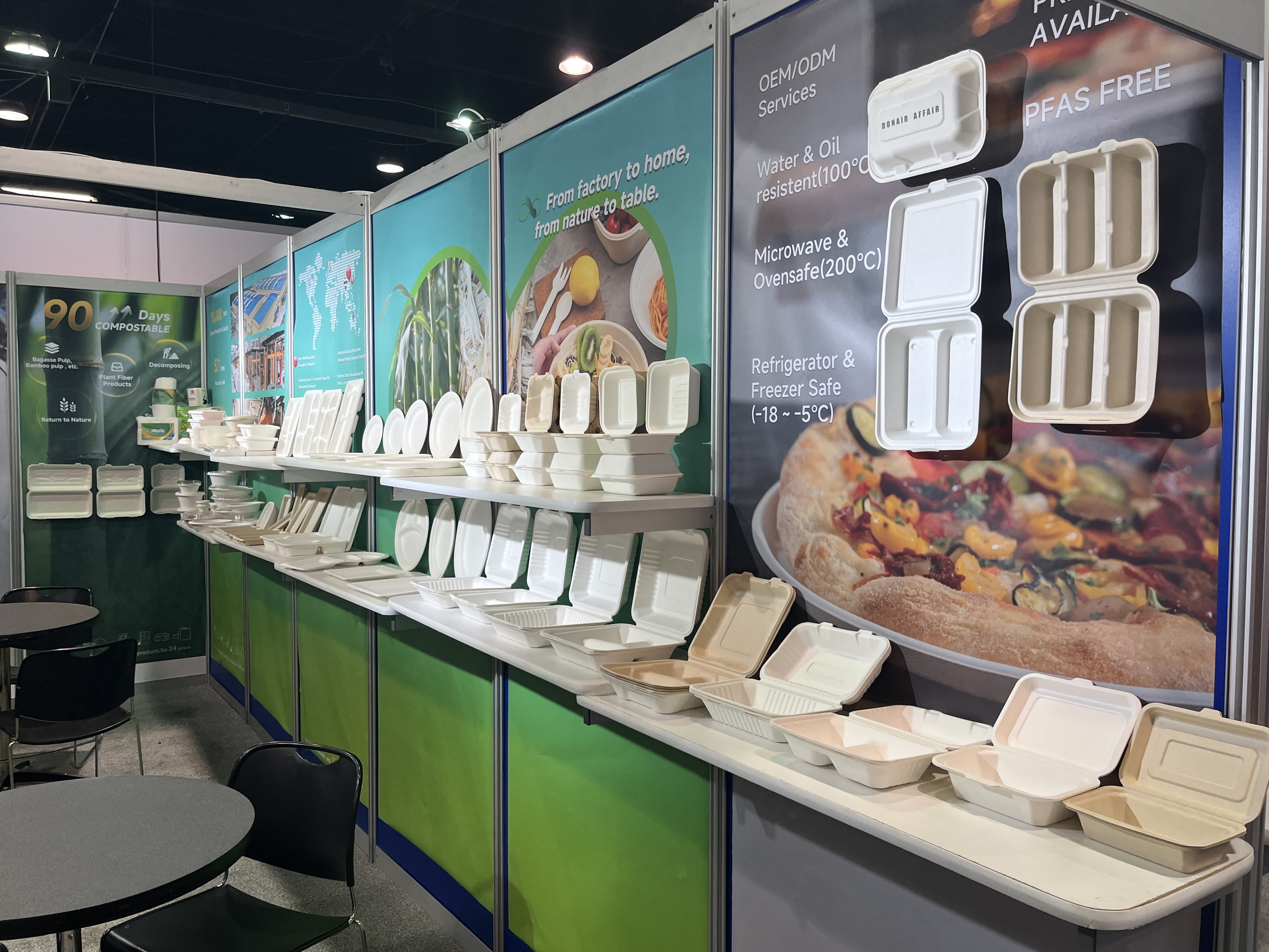 作为专业的甘蔗浆餐具工厂,我们在此次展会上向国际市场展示了多款创新产品。