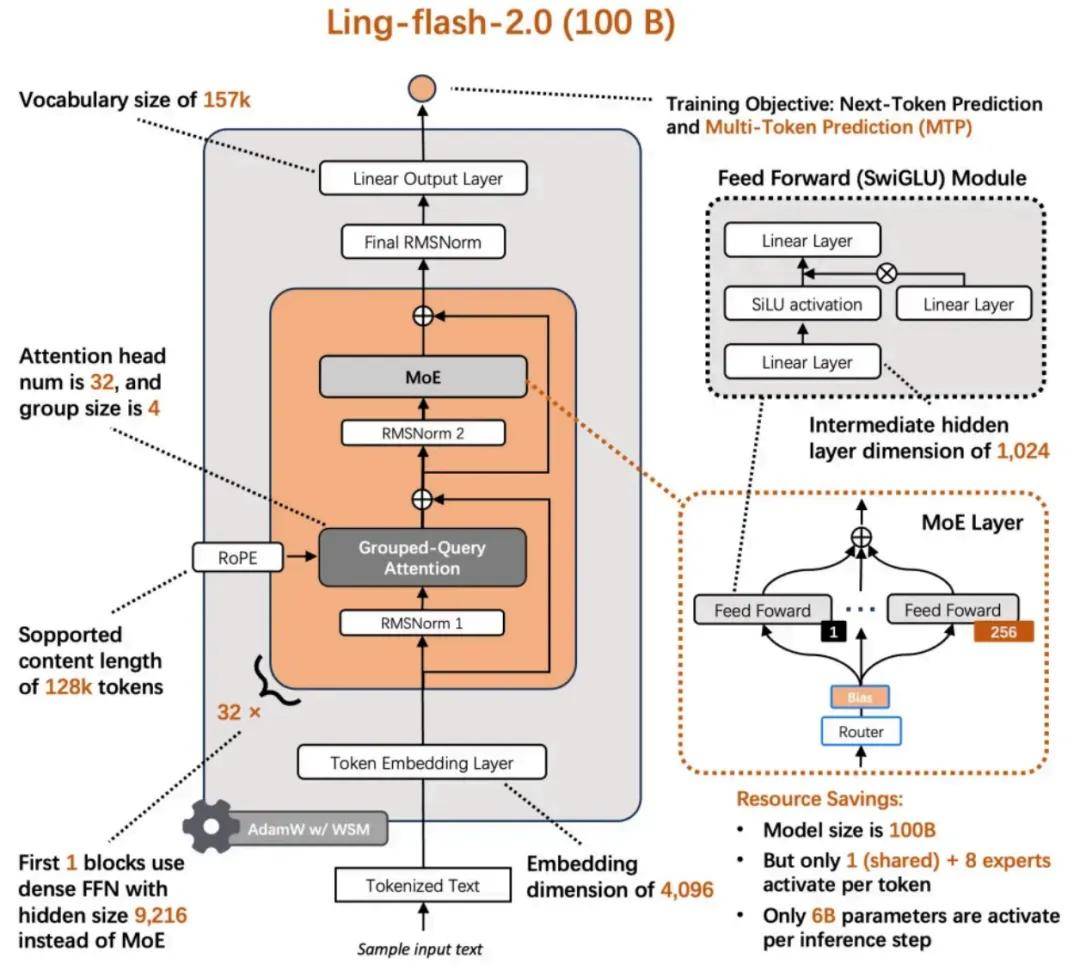 在 Ling Scaling Laws 的指导下,只激活 1/32 参数(61 亿),并在专家粒度、共享专家比例、注意力平衡、无辅助损失函数 + Sigmoid 路由、MTP 层、QK-Norm 和 Partial-RoPE 等核心组件上进行了全面优化。