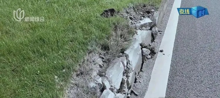 路边绿化带的坎坡在被车辆撞击后受到巨大的破坏。