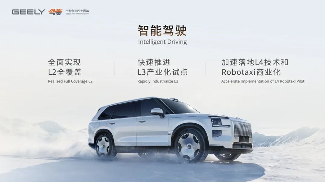 智能驾驶领域,在L2级辅助驾驶已向10万级车型普及的行业趋势下,吉利实现全系覆盖的同时,推进L3产业化试点与L4级Robotaxi商业化落地,进度与小鹏、广汽昊铂等国内车企基本同步,相较于丰田计划2030年大规模落地固态电池时同步推进智驾升级的节奏更显激进。