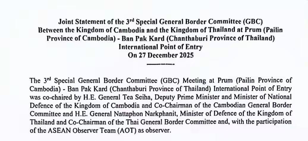 先看清,停火协议里到底藏啥门道?12月27日,泰柬边界总委员会第三次会议在泰国尖竹汶府边境口岸召开,泰国国防部长纳塔蓬与柬埔寨副首相兼国防大臣迪西哈共同签署联合声明,宣布当日中午12时起停火协议正式生效,边境地区的枪炮声随之平息。此次会议未设置繁杂仪式,双方直接聚焦停火核心议题,凸显出尽快终结冲突的共同诉求。