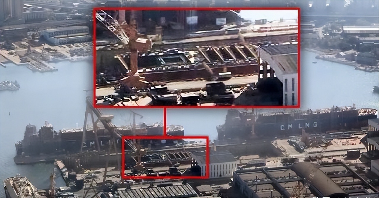 大连造船厂是004型航母的主战场,从2025年初开始,船坞里就出现了宽达43米的船体分段。卫星图像显示,船体模块已经在组装,两个方形结构被认为是核反应堆的安全壳,每个边长约18米。