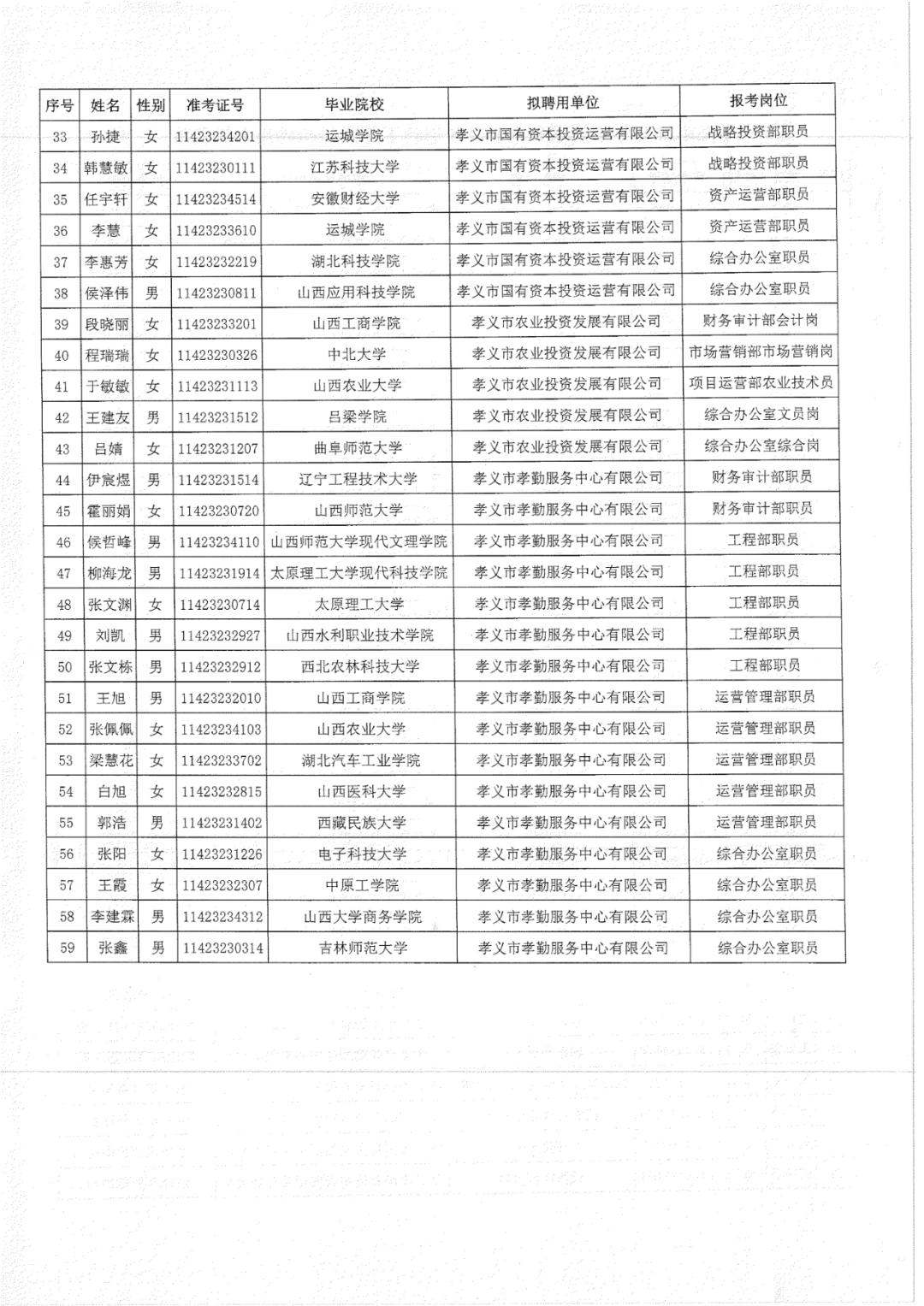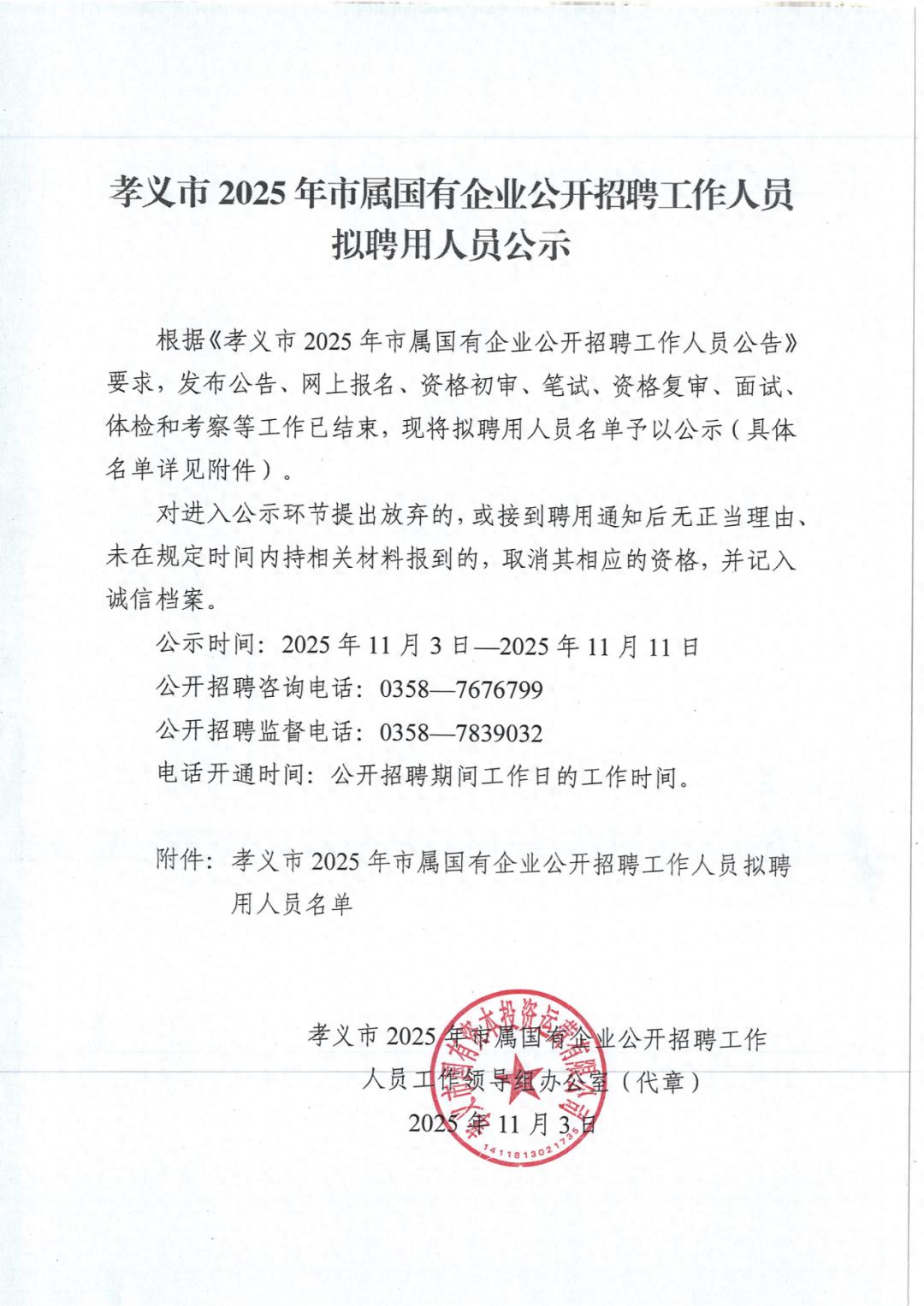 孝义市2025年市属国有企业公开招聘工作人员拟聘用人员公示