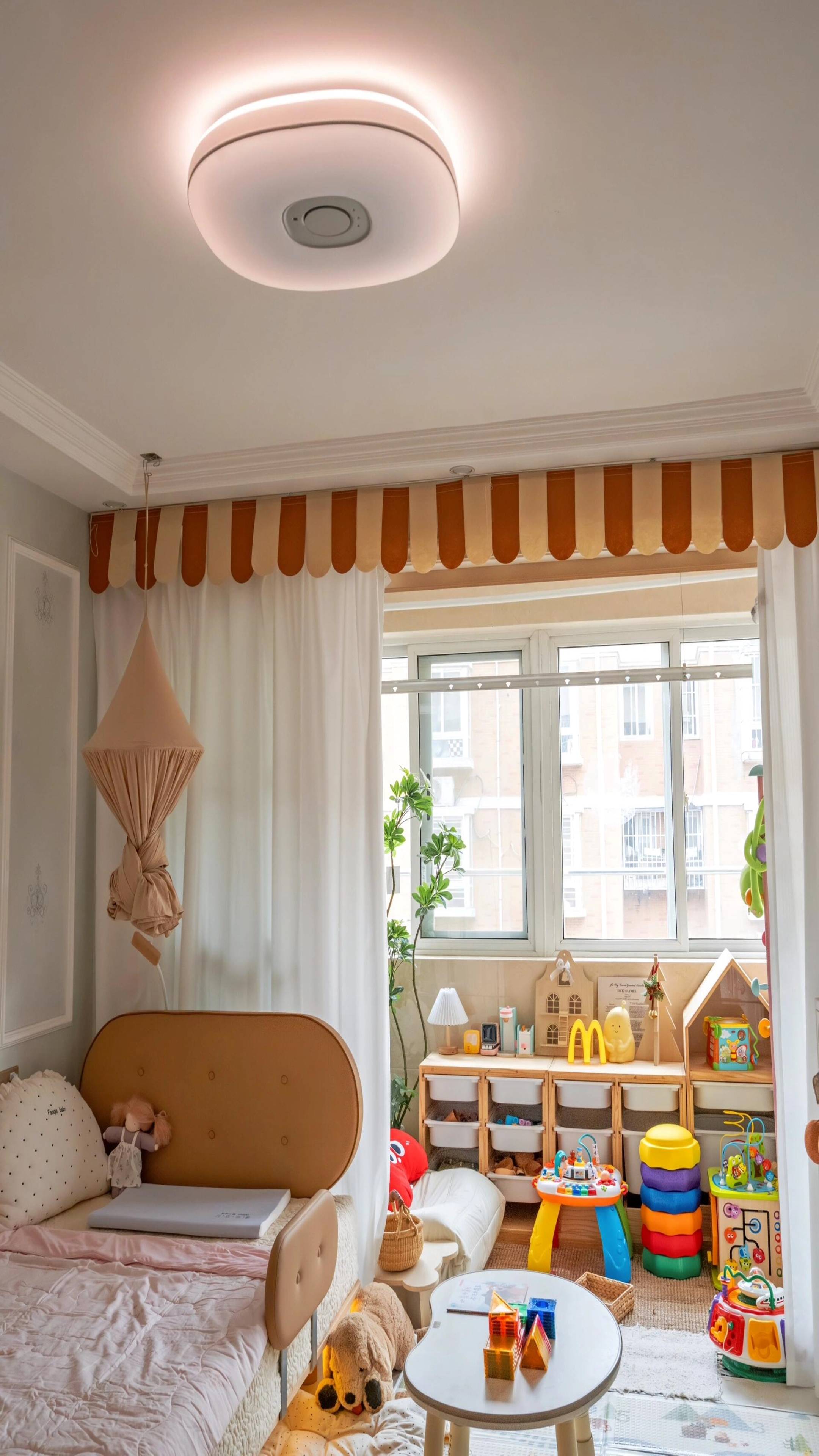 选购建议:优先选固定暖光的吸顶灯,色温严格控制在2700K-3000K之间——2700K被称为“月光色”,光线最柔和,适合睡前休憩;3000K暖光亮度适中,适合日常学习、玩耍。绝对禁止选择6500K冷白光,避免对视力和睡眠造成双重伤害。