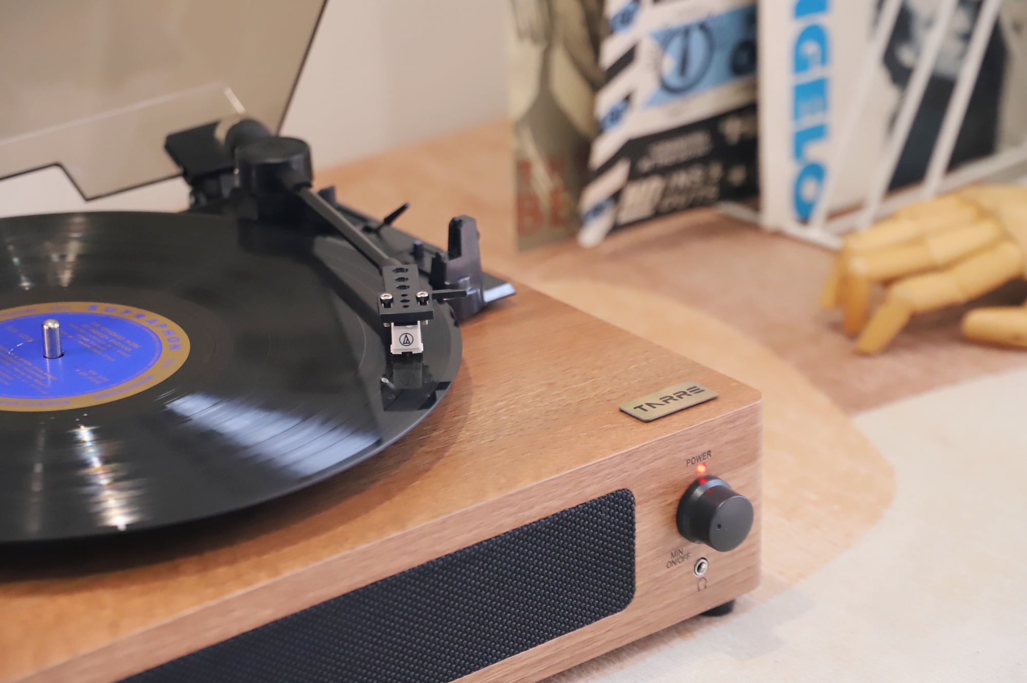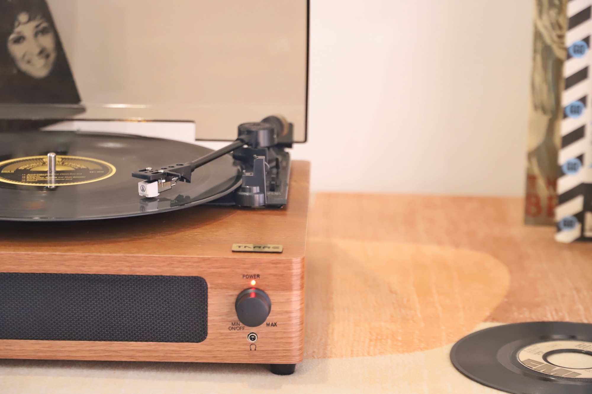 塔瑞尔TARRE黑胶唱片机TE-01作为一款售价在五百元内的,对于核心配件却一点也不含糊:搭配铁三角AT-3600L动磁唱头提供了出色的唱片解析能力和声音还原能力,唱针压力也可以通过唱臂和配重块进行适当调节,让不同厚度的唱片都能获得适配的播放效果。内置两个3W立体声扬声器形成立体声场,加上封闭式音腔设计,无需外接音箱就能直接播放黑胶唱片。