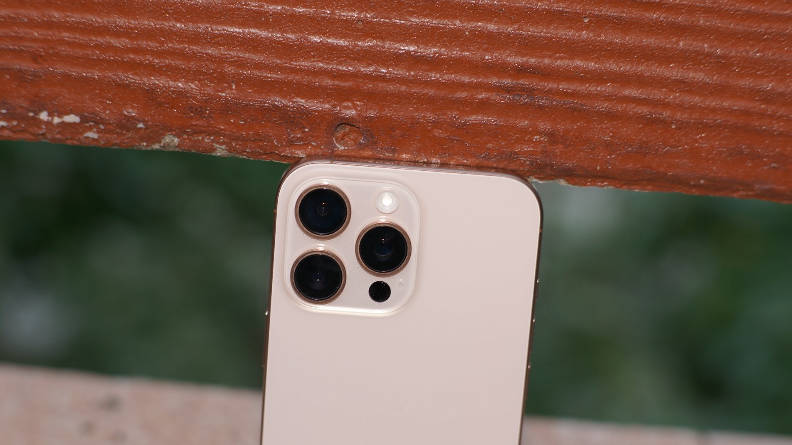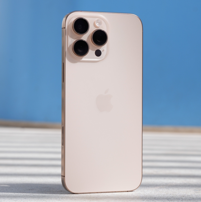 谈到外观,它的一体性以及用料其实更加扎实。新一代使用的是降级的铝合金边框,而iPhone 16 Pro Max使用的是5级钛合金边框,硬度更高,耐摔能力比传统的手机要提升了数十倍。后盖则采用了玻璃一体化的冷雕工艺。使得它的整体性更加的讨喜,尤其是“浴霸三摄”的设计,看起来也更有精神。而正面使用的那块6.9英寸的XDR屏幕和新款差距也不大,同样是支持120Hz高刷,只不过亮度略低一些。