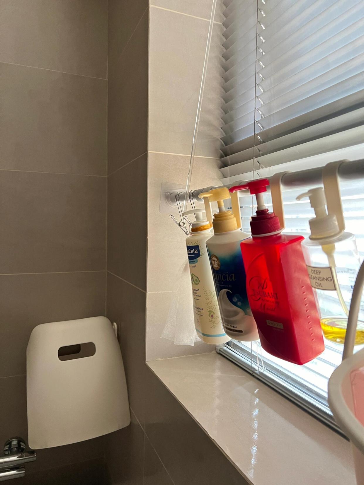 伸缩杆+挂钩,固定在窗台上方,把洗浴的瓶子都挂上去,要用的时候拿下来挤了再挂上去。