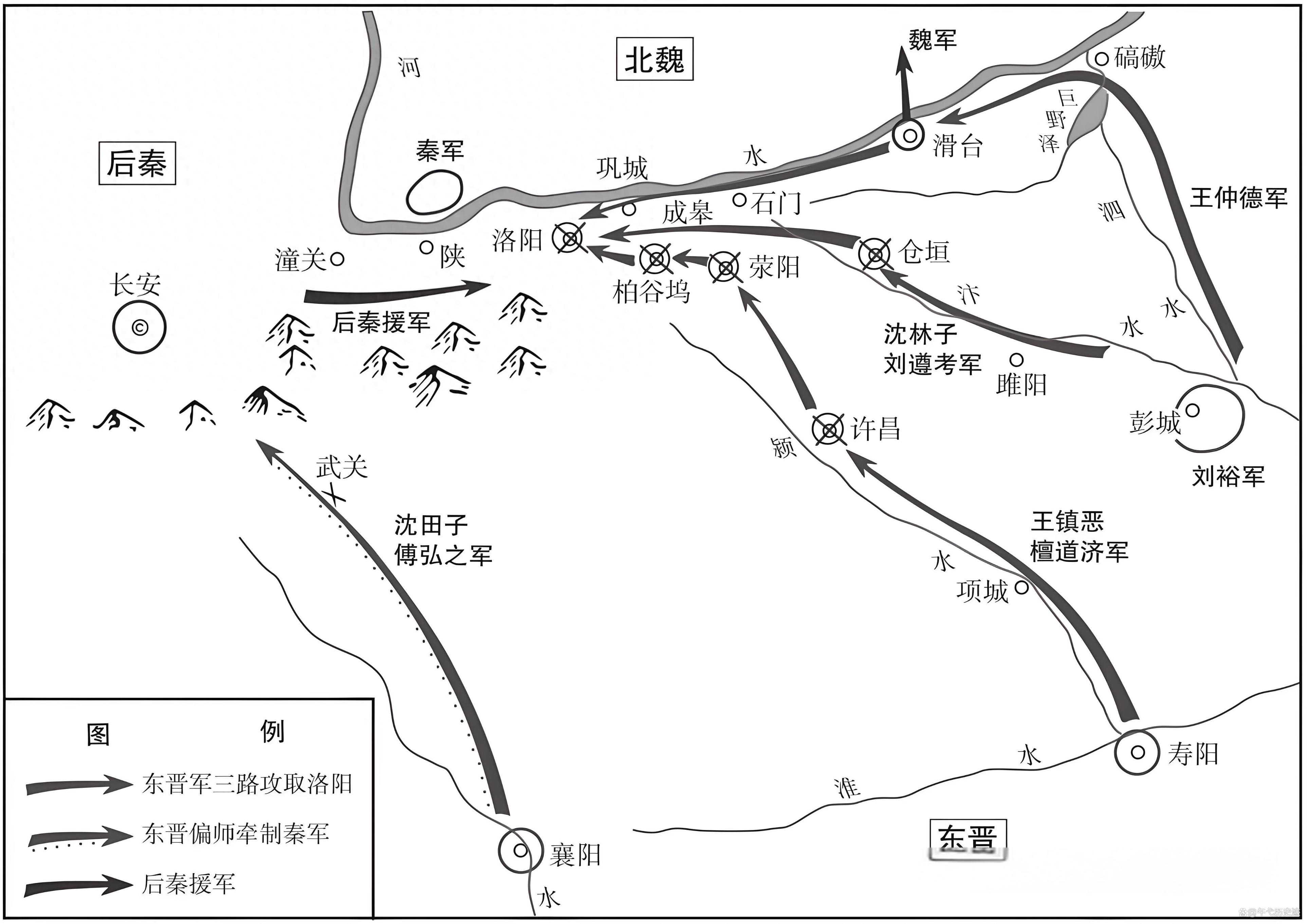 王镇恶与檀道济的东路军的进展则更为迅速。王镇恶一家身为流亡东晋的关中人,他几兄弟都急于打回关中,富贵还乡。出征之前,刘裕也特意派刘穆之到建康城北王镇恶的驻地慰问他,说:“今委卿以关中,想勉建大功,勿孤此授。”王镇恶当即表态:“不克咸阳,誓不复济江而还也!”