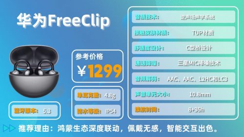 华为FreeClip主打舒适佩戴,单耳重量5.1克,采用云感C形桥设计,亲肤液态硅胶材质,戴在耳朵上几乎没存在感,久戴也不会留压痕,很多用户都觉得它的佩戴体验无可挑剔。依托鸿蒙生态,它的智能交互很加分,支持头动交互、小艺翻译、星闪查找等功能,和华为手机搭配使用,能实现开盖秒连、多设备协同,用起来很省心。