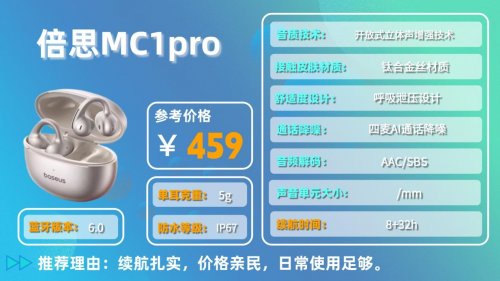 倍思MC1pro主打实用主义,价格适中,适合预算有限、追求基础体验的用户。佩戴设计贴合耳廓,重量控制合理,日常通勤、办公佩戴不会有明显负担,就算戴眼镜也不会互相干扰,兼容性不错。