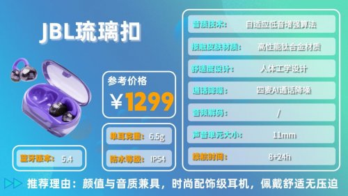推荐理由:颜值与音质兼具,时尚配饰级耳机,佩戴舒适无压迫。