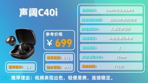 声阔c40i外观简洁干净,单耳重量5.7克,日常戴在耳朵上很轻盈,几乎没有负担,便携性很好,出门随便塞进口袋就行。搭载蓝牙5.4芯片,连接速度快且稳定,日常使用不会出现断连的情况,IPX4级防水,能应对日常出汗和轻微溅水。