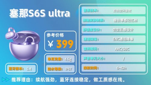 塞那S6S ultra做工不错,质感在线,拿在手里不会有廉价感,重量很轻,佩戴舒适,日常长时间戴也不会觉得累。续航是它的一大优势,单耳能听7.5小时,配合充电仓总续航可达38小时,还支持快速充电,充电10分钟就能用1小时,应急很方便。
