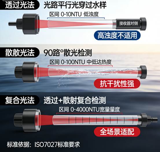 核心原理:同时测量透射光与散射光强度,通过特定算法(如比率法)综合计算浊度值,既保留透射光法在低浊度场景的精准度,又兼具散射光法在中高浊度场景的稳定性。