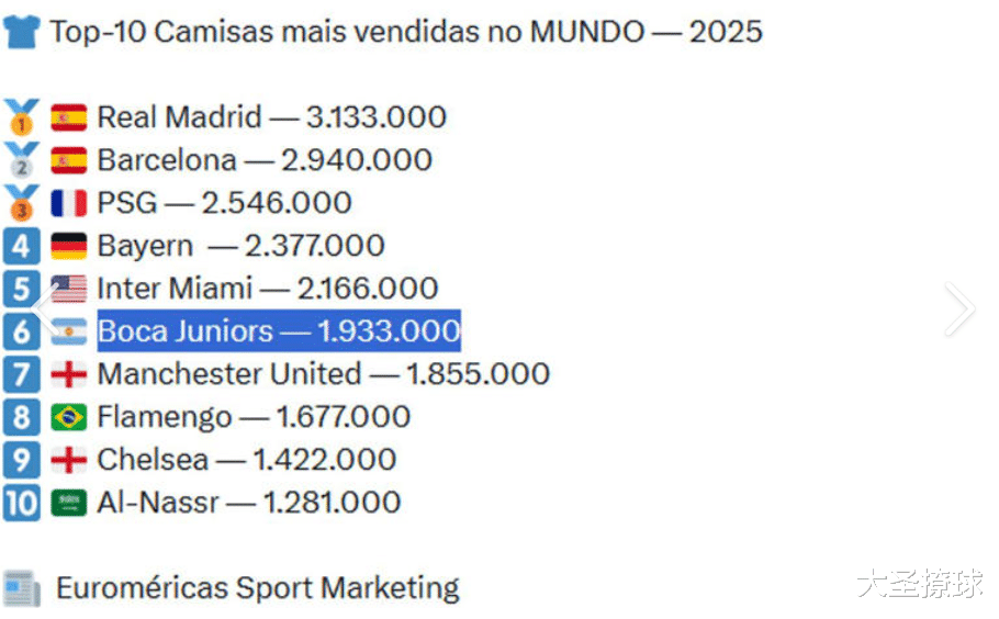 相比之下,C罗的利雅得胜利仅以128万件球衣排名第10,这个数字并不算少,但依然远远落后于梅西在美国的影响力。作为世界上最具影响力的体育明星之一,C罗改变了沙特俱乐部的形象。但这尚不足以让利雅得胜利的商业价值比肩迈阿密国际这样的球队。