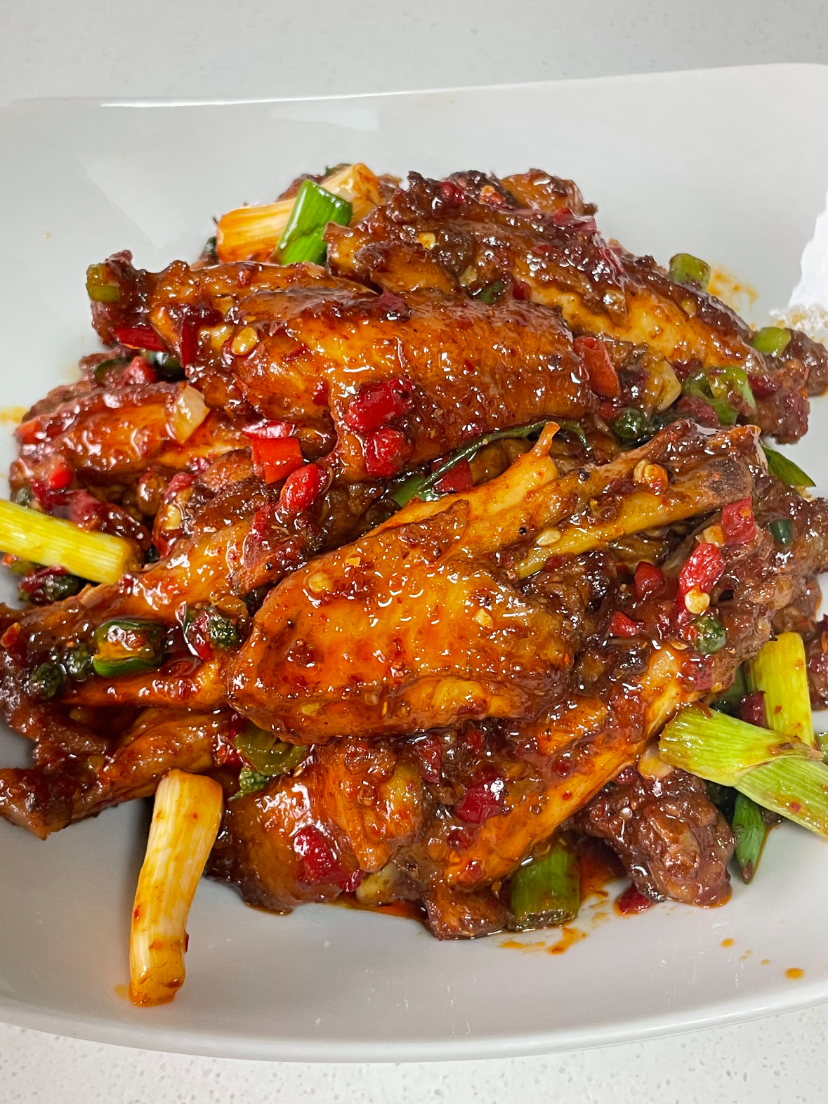 时间到,开盖,大火收汁,汤汁从清汤寡水变成黏稠挂壁,撒粗辣椒粉,翻三下,辣椒颗粒被热油一激,辣香直冲天灵盖。最后把蒜苗梗和青辣椒圈丢进去,炒十秒出锅,颜色瞬间提亮,绿得嚣张,红得热烈,像给鸡翅戴了圣诞帽。