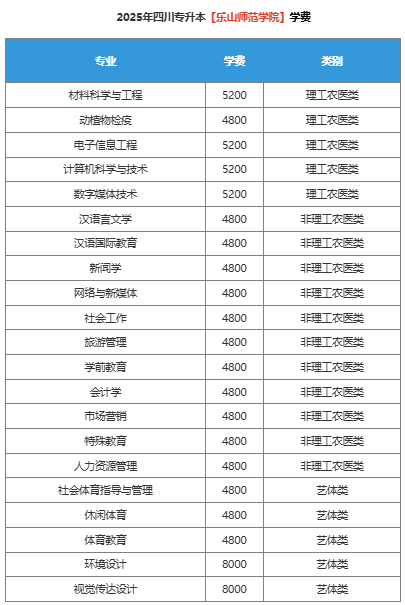 根据乐山师范学院2025 年专升本招生简章,统招专升本今年有21个专业招生,学费集中在 4800 - 8000元 / 年。