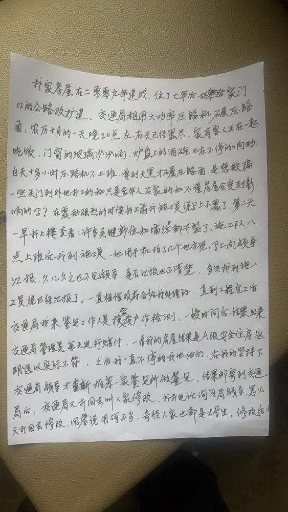 彭联阁、袁玉兰夫妇的自建房 2009 年建成,住了 7 年后,恰遇家门口的公路改扩建。施工期间,交通局租用大功率压路机碾压路面 ——“农历十月的一天晚 20 点左右,天已经黑尽,家里有客人一起吃饭,门窗的玻璃沙沙响,炉盘上的酒碗也在不停的响动。” 彭联阁回忆,施工方白天 10 多小时不作业,偏要到天黑才碾压路面。