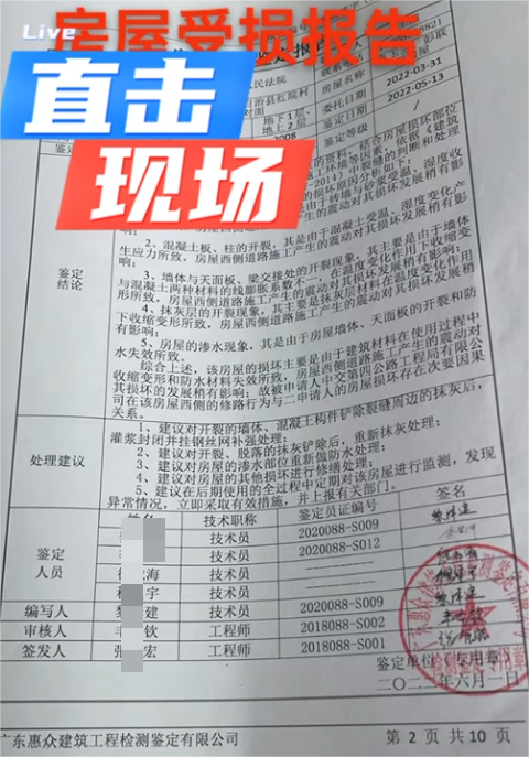最开始震动时,彭联阁上前找施工员说 “受不了了”,第二天一早他上楼查看,发现 “许多关键部位和墙体都开裂了”。施工员 8 点上班后,彭联阁找到对方,对方用手机拍了几个地方说 “马上向领导汇报”,但 “久而久之也不见领导,是否汇报也不清楚”,多次找到施工员都只说 “已经汇报了”。彭联阁一直相信政府会协调处理,直到工程完工后,交通局才找来鉴定工作人员挨家户检测。
