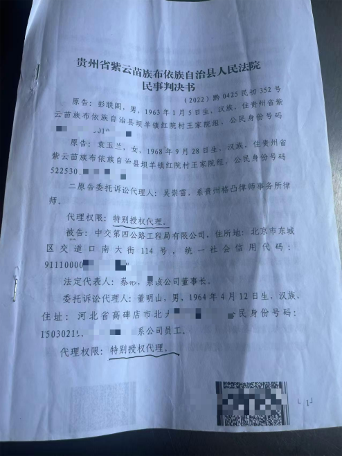 2022 年 2 月,彭联阁夫妇将中交第四公路工程局有限公司、紫云苗族布依族自治县交通运输局告上法庭,索赔房屋损失 75 万元,并要求交通局承担连带责任。为维权,他们还支付 6000 元基础费 + 5% 风险代理费,聘请了律师作为委托代理人。