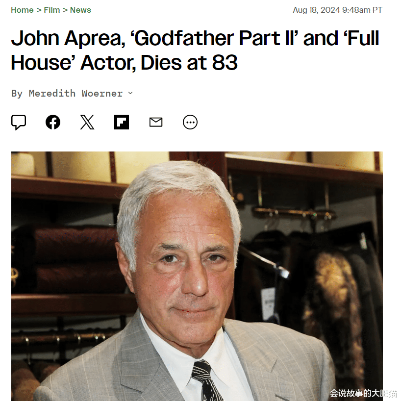 外媒最新消息,因出演《教父2》和《欢乐满屋》而闻名的好莱坞资深男演员约翰·阿普雷亚(John Aprea)去世,享年83岁。