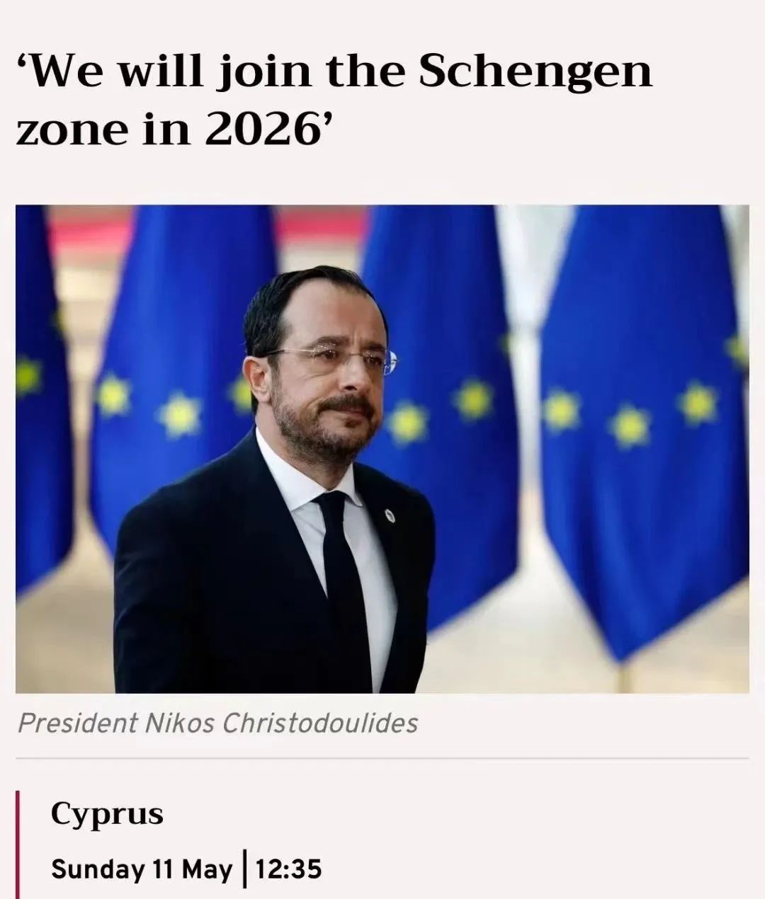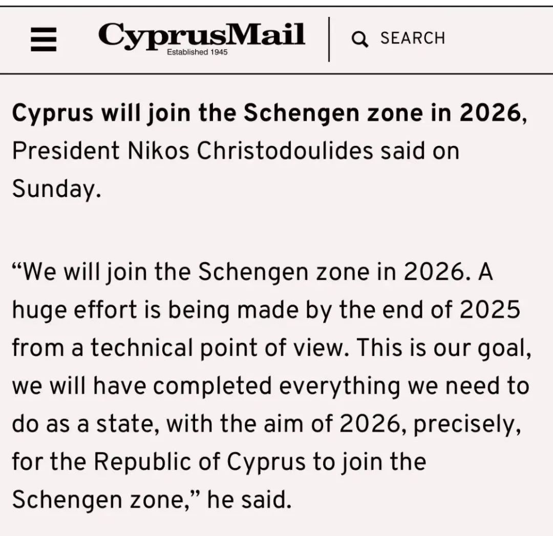 塞浦路斯将于2026年加入申根,所有必要的技术要求将于2025年底前完成。