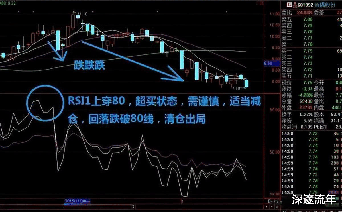 3、RSI1(白色线)从高位跌破了80,这是卖出信号
