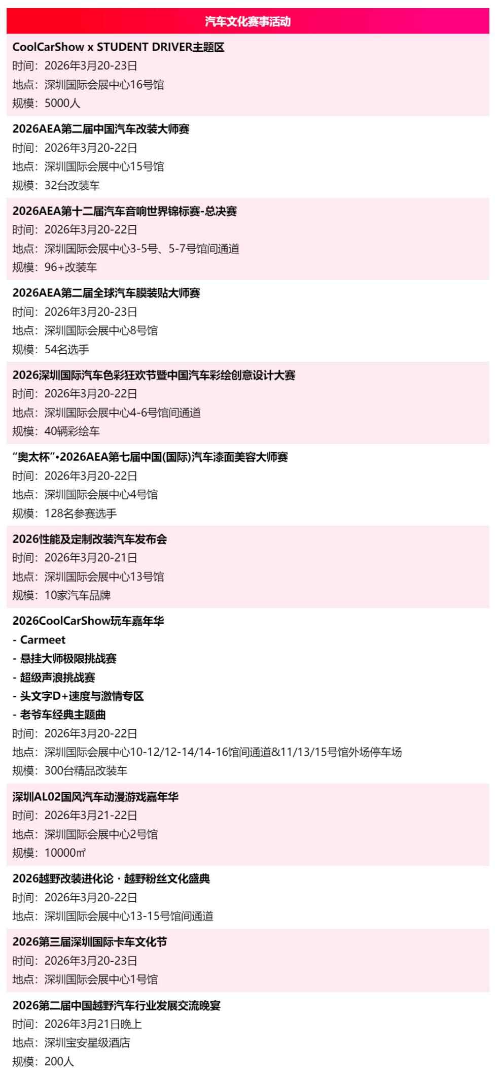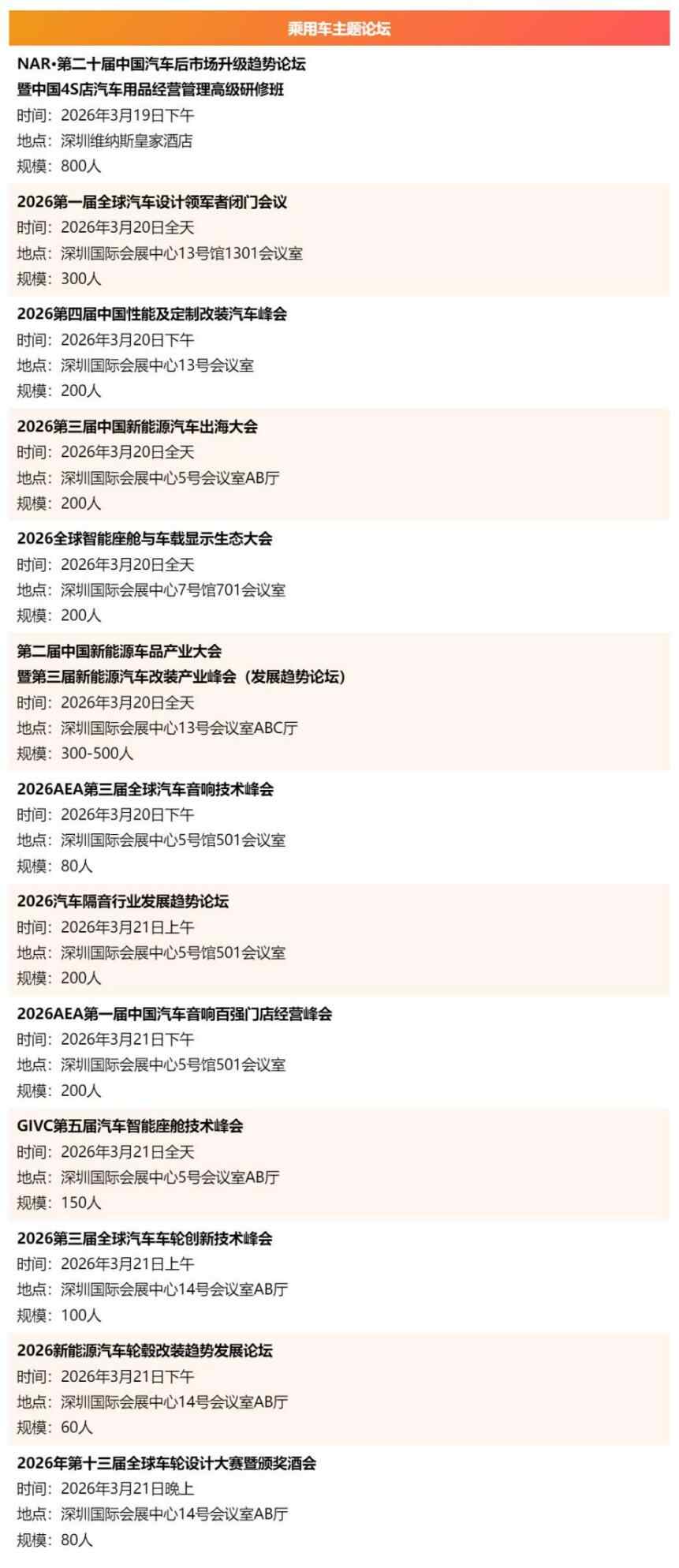 2026年展会同期将围绕乘用车、商用车、跨境出海、汽车文化等热点,设置70+场行业趋势论坛、国际技术峰会、跨境电商大会、文化赛事,以前瞻议题和深度洞察,为全产业链的参与者带来新的启发与合作契机,注入强劲发展动能,共同助力企业在转型浪潮中抢占先机。