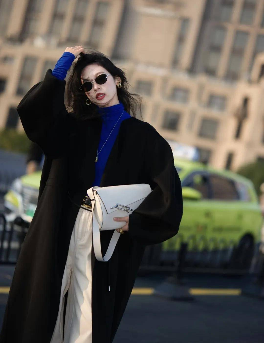 一件经典的黑色大衣搭配蓝白配,成为了点睛之笔。不仅在视觉上起到了收缩作用,整体搭配显得更加修长挺拔,形成了一种难以言喻的高级感。