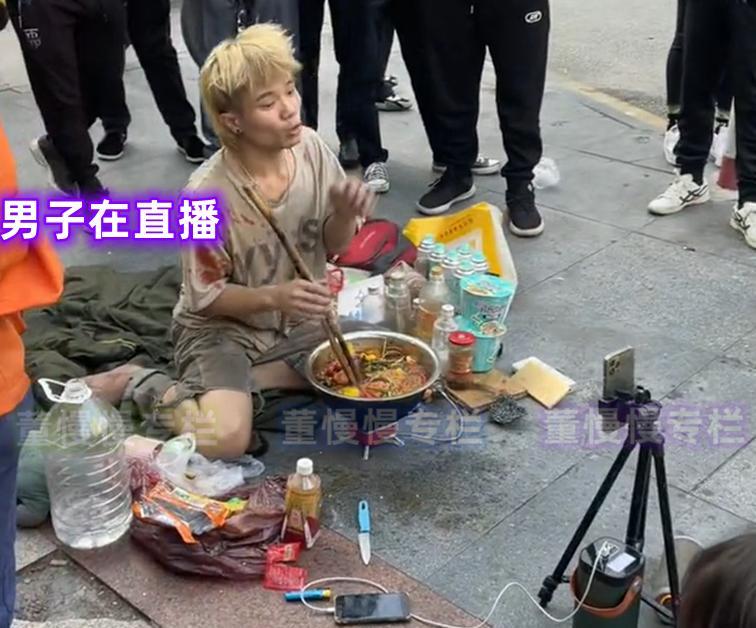 事情发生在广东佛山的街头,一名年轻的男子坐在路边,一边煮面吃一边直播,偶尔还对着粉丝大喊“感谢大哥”。