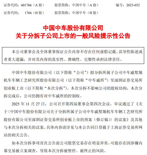 【环球网消费综合报道】11月28日,市值超2000亿元的央企巨头中国中车发布公告,宣布拟分拆其所属子公司中车戚墅堰机车车辆工艺研究所股份有限公司(简称“中车戚所”)至深圳证券交易所创业板上市。本次分拆完成后,中国中车仍将保持对中车戚所的控制权,公司股权结构不受影响。