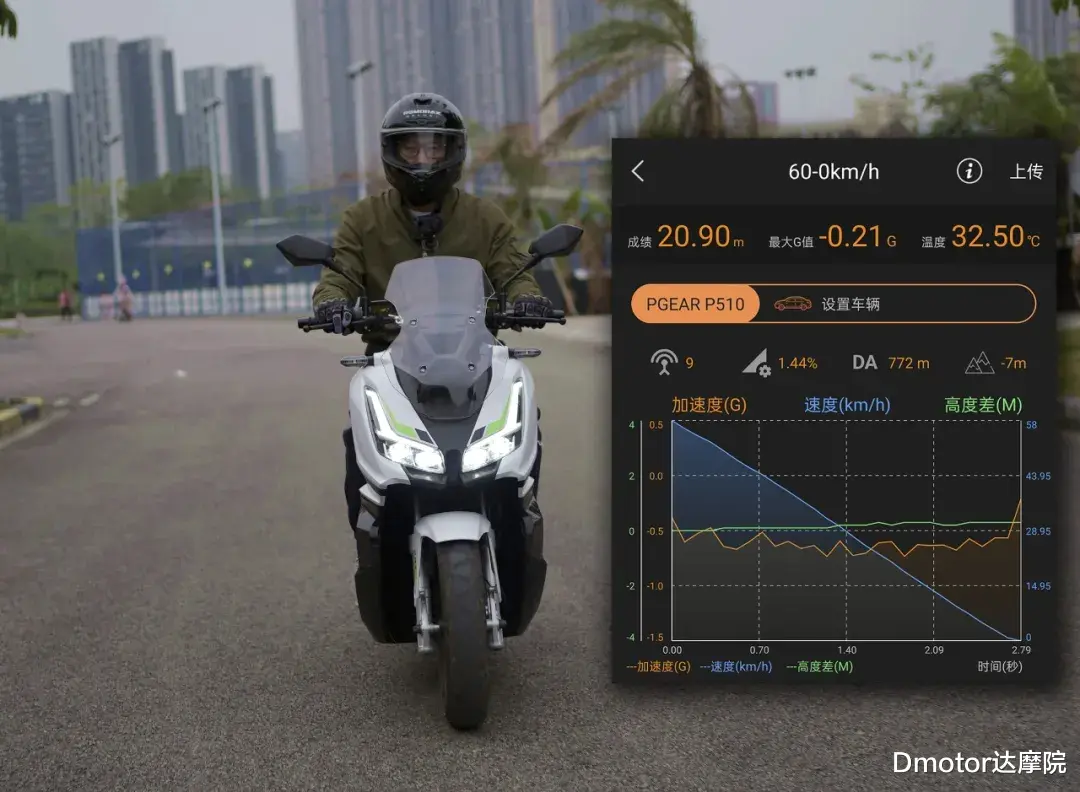 刹车方面,司机也进行了60公里每小时到0的全力急刹测试,刹车距离大概是在20米左右,对比目前的150cc燃油踏板这急刹距离也差不多。
