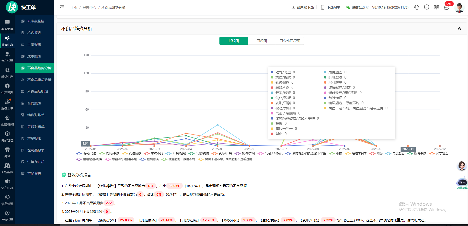 而且快工单的客服真的太负责了!上线初期,工人有不懂的地方,打客服电话,几分钟就有人指导;后来我们想新增一个 “设备故障分类统计” 的功能,跟客服提了需求,没过多久就迭代上线了,真的是懂制造业的需求,响应也快。
