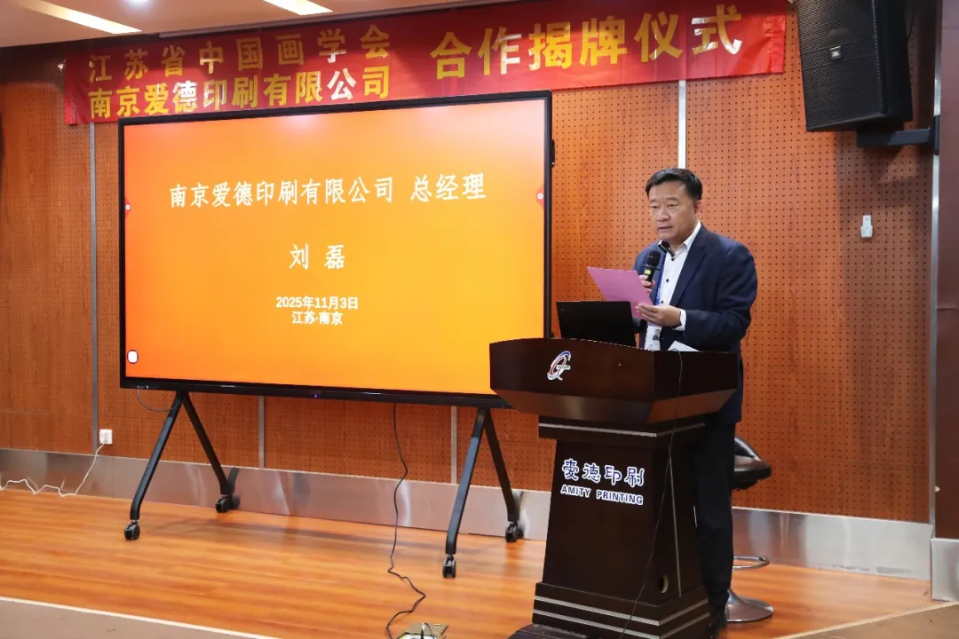 仪式现场,刘磊总经理首先致辞,南京爱德印刷始终秉持“传播文化、促进交流”的社会责任,此次与江苏省中国画学会合作,是“艺术”与“匠心”的美丽邂逅,更是传统文化与现代产业融合的有益尝试。“中国画是讲好中国故事的绝佳载体,爱德将以精密印刷技术与国际传播渠道为支撑,让东方艺术之美走向更广阔的世界舞台。”他也特别向让・高立昂院士的莅临表示敬意,称其到来为基地注入国际视野,契合“搭建中外文化艺术之桥”的初衷。