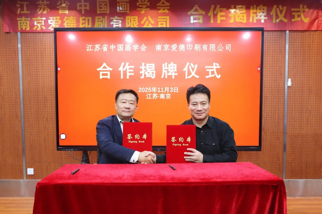 仪式最后,翟优会长与刘磊总经理共同为“中外文化艺术交流基地”揭牌,并签署合作协议。双方均表示,将以此次合作为新起点,让江南水墨的灵秀、中国画的气韵突破地域与语言界限,同时为爱德印刷的文化传播版图注入东方艺术底蕴,让每一份印品都成为有温度、有内涵的“文化使者”。