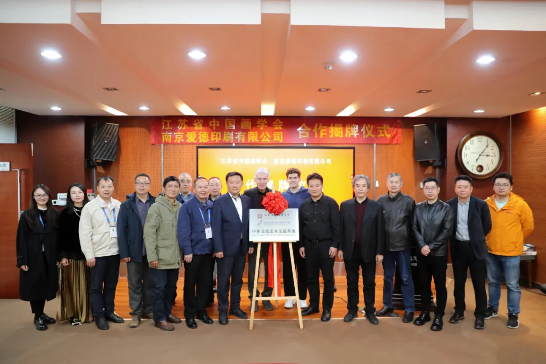 11月3日,江苏中国画学会与南京爱德印刷有限公司签约暨中外文化艺术交流基地合作揭牌仪式在南京爱德印刷公司举行。出席仪式的有法兰西艺术院通讯院士让・高立昂、法兰西艺术院通讯院士助理顾博,江苏省中国画学会会长翟优,副会长王平、王野翔、桑建国、韩非,副监事长孙渊远,副秘书长陈岩、顾光明,学会理事杨家林,南京爱德印刷总经理刘磊、南京爱德印刷副总经理刘军民、南京爱德印刷总经理助理吴奎、南京爱德印刷外贸业务部高级经理孙亚丽、南京爱德印刷人事行政中心经理助理姜先动,仪式由南京爱德印刷内贸业务部苏琰主持,共同见证这一推动中外文化艺术互鉴的重要时刻。