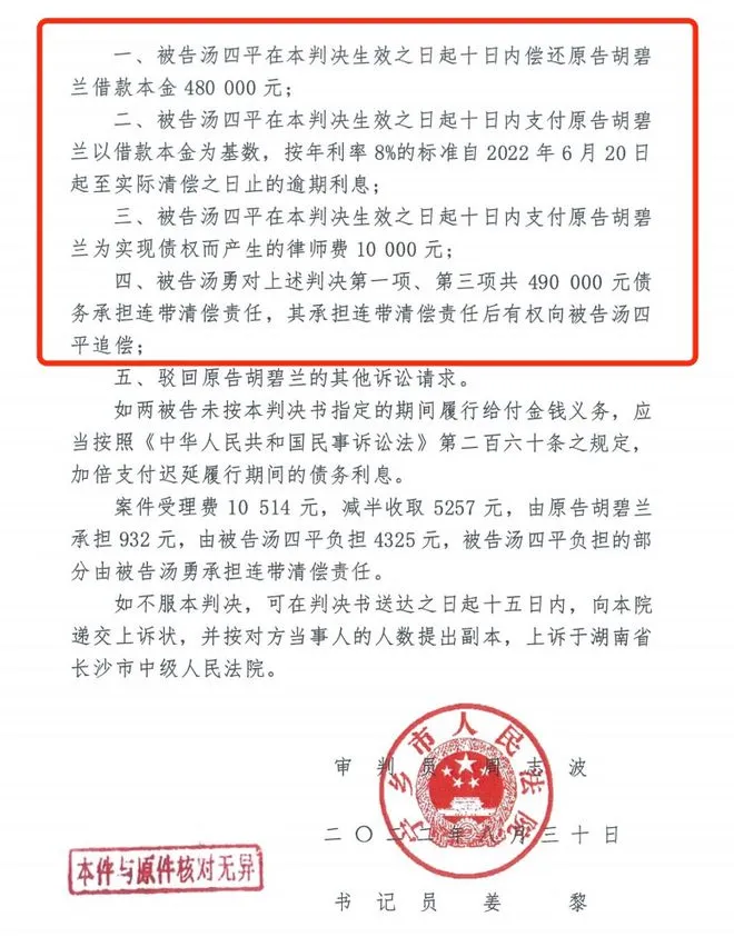 2022年8月30日,双方借贷纠纷经由法院判决,汤四平父子尚欠举报人胡碧兰本金48万元及相应利息。