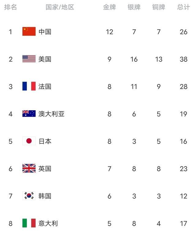 奥运最新金牌榜:中国破12金高居第一,提前锁定一金,但射击丢金